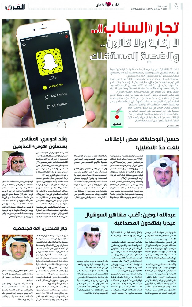 طرحت «العرب» قضية إعلانات المؤثرين على منصة سناب شات، في عددها الصادر بتاريخ 22 نوفمبر 2020.