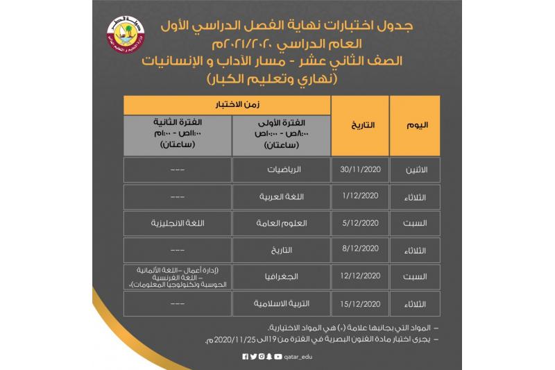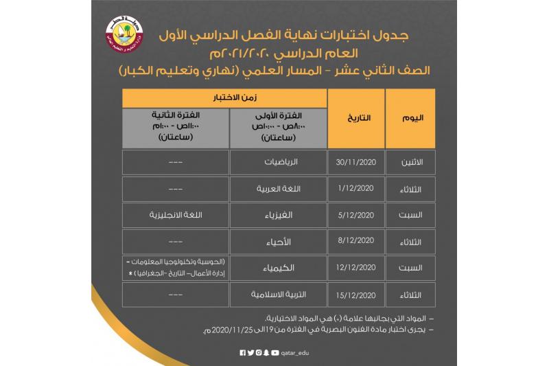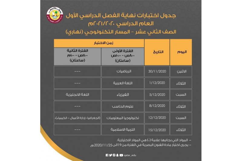 وفيما يلي جدول يوضح مواعيد اختبارات نهاية الفصل الدراسي الأول لطلبة المستوى الدراسي الثاني عشر (النهاري، وتعليم الكبار) بمختلف المسارات: