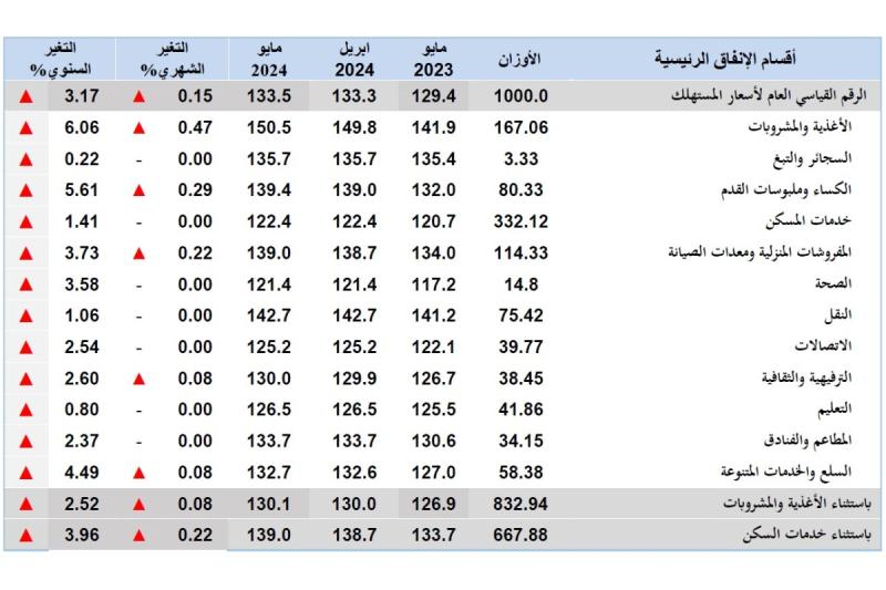 حركة الأسعار السنوية في شهر مايو 2024 حسب المجموعات الرئيسية: