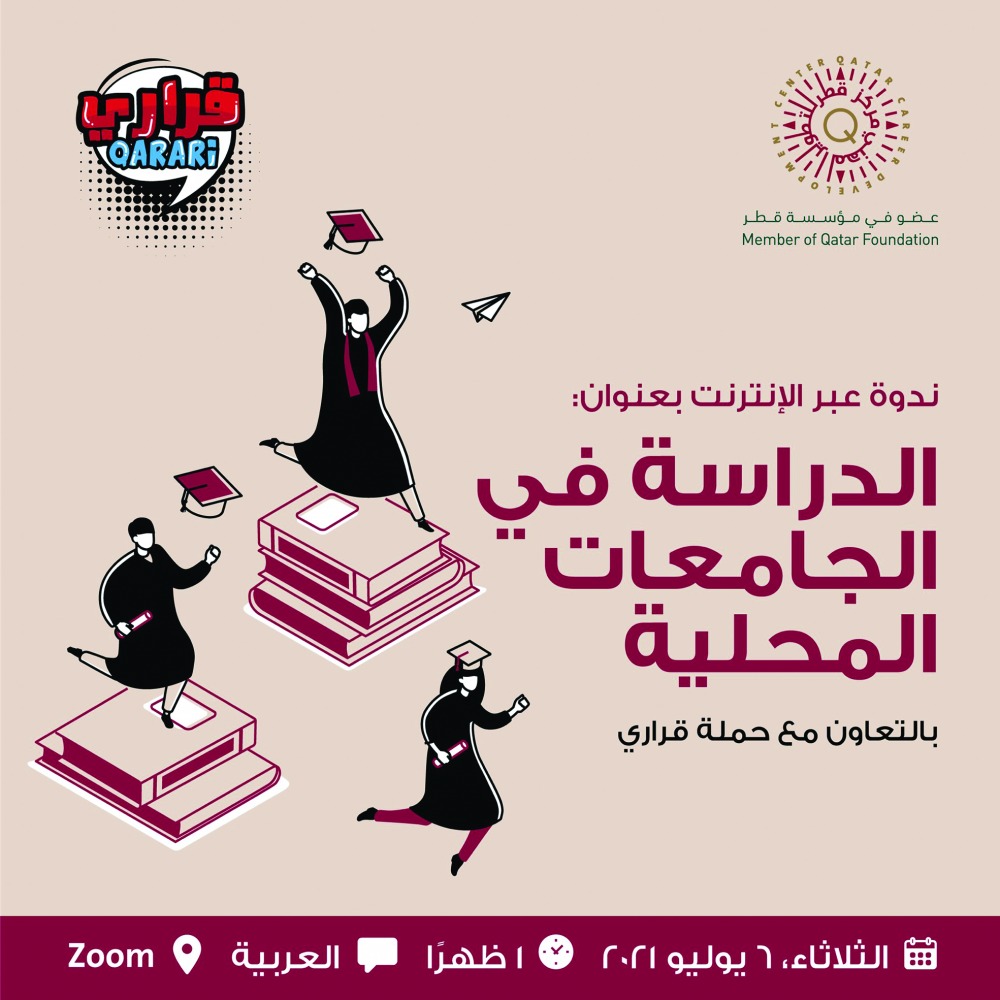 دعا مركز قطر للتطوير المهني، عضو مؤسسة قطر للتربية والعلوم وتنمية المجتمع، طلاب المرحلة الثانوية وأولياء الأمور، لحضور ندوة مباشرة عبر الإنترنت بعنوان «الدراسة في الجامعات المحلية».