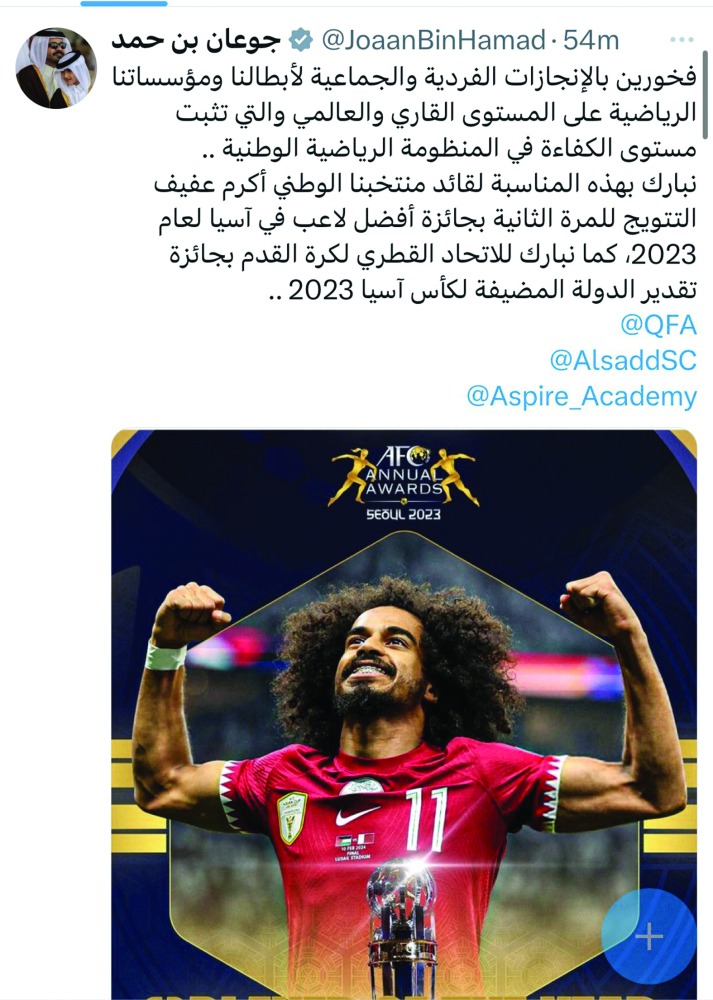 أعرب سعادة الشيخ جوعان بن حمد آل ثاني رئيس اللجنة الأولمبية القطرية عن فخره الكبير بالإنجازات القطرية الرائعة على المستويين الفردي والجماعي. وقال سعادته عبر حسابه الشخصي على منصة X « فخورون بالإنجازات الفردية والجماعية لأبطالنا ومؤسساتنا الرياضية على المستويين القاري والعالمي والتي تثبت مستوى الكفاءة في المنظومة الرياضية الوطنية.. نبارك بهذه المناسبة لقائد منتخبنا الوطني أكرم عفيف التتويج للمرة الثانية بجائزة أفضل لاعب في آسيا لعام 2023، كما نبارك للاتحاد القطري لكرة القدم بجائزة تقدير الدولة المضيفة لكأس آسيا 2023».